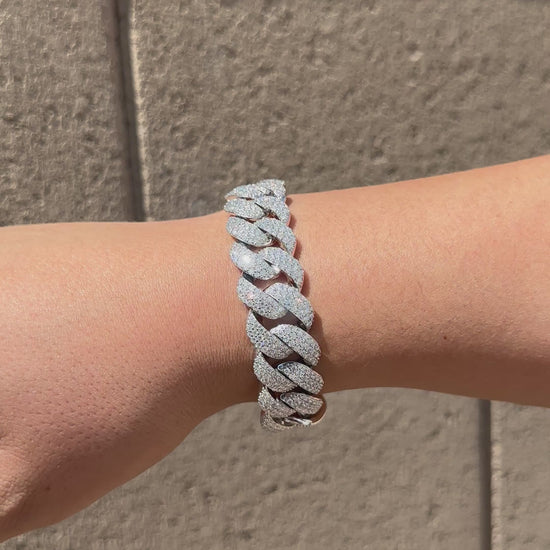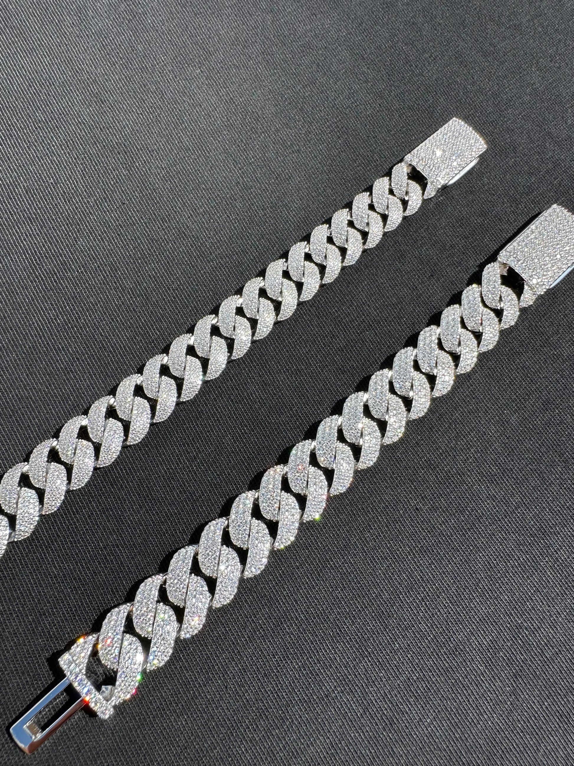 Crafted from solid 925 sterling silver and dipped in rich Rhodium plating, this bracelet takes shine to another level. It’s fully flooded with hand-set VVS moissanite stones, each placed in a precision micro pavé setting for a continuous, fiery sparkle that catches light from every angle.